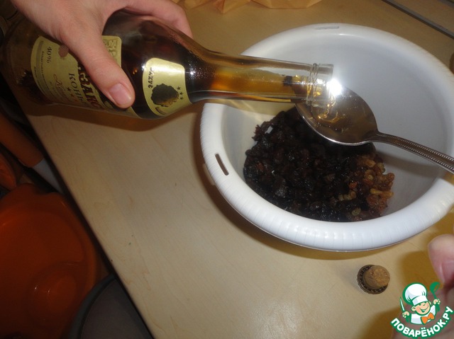 Изюм и чернослив запарить на 15 минут кипятком. Промыть, обсушить. Чернослив нарезать мелкими кусочками. Выложить в удобную посуду и добавить 4 ст. л. коньяка или рома, перемешать и тоже убрать в холодильник!