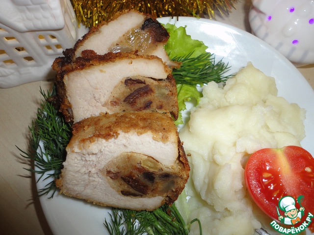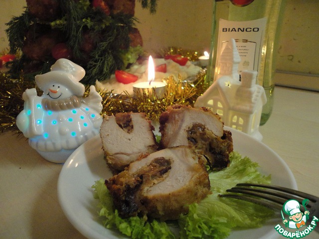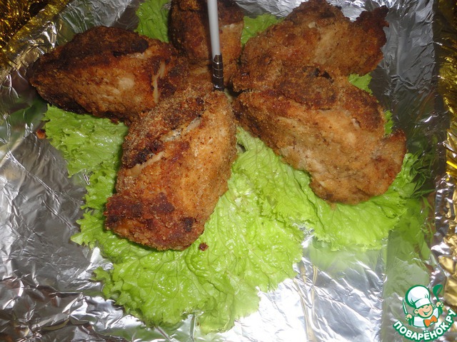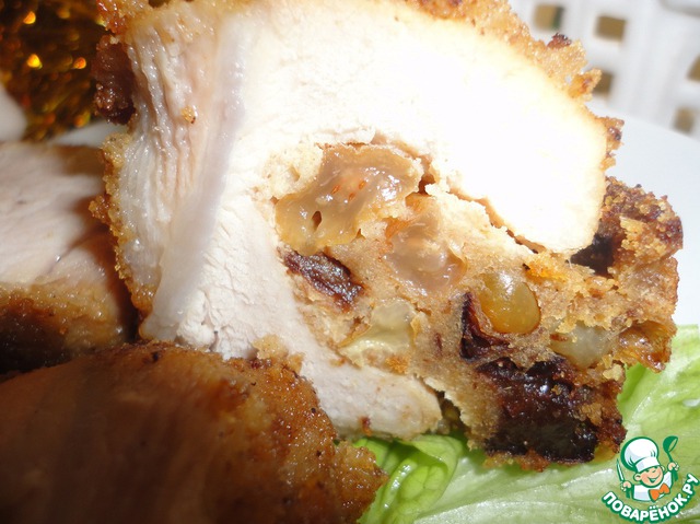 Теперь фаршируем "кармашки". Скрепить кармашки шпажками или зубочистками. Обвалять в сухарях. Включаем духовку на 180град.