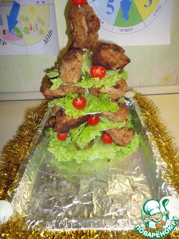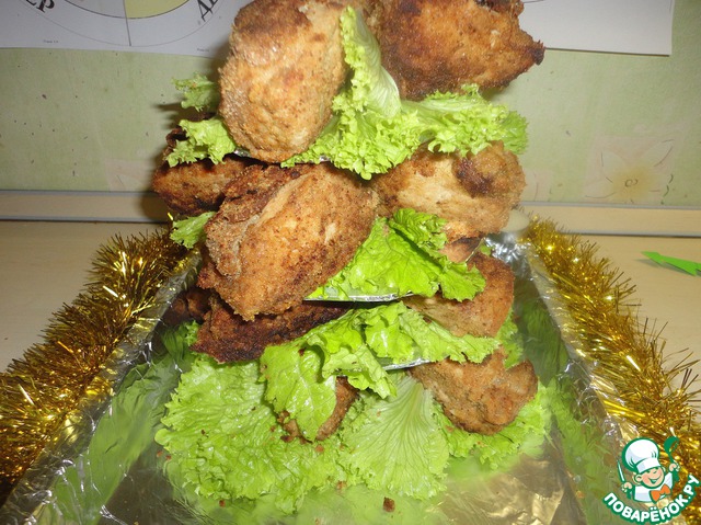 Ставим это сооружение в центр формы. Выкладываем листья салата, сверху обжаренные горячие кусочки.