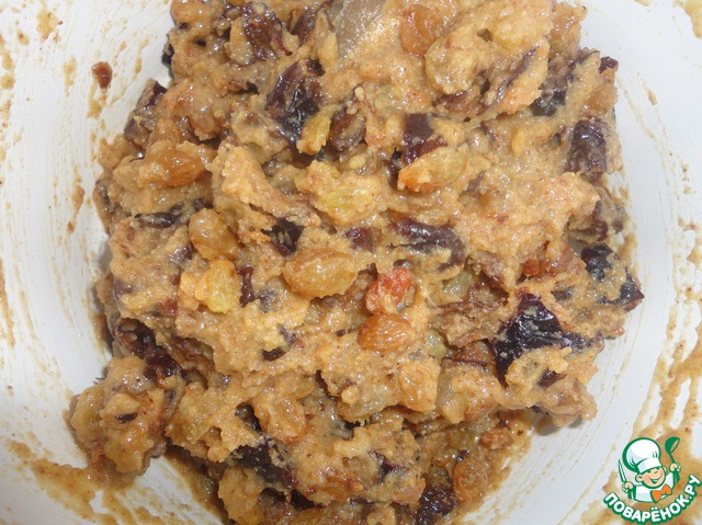 Взбить 4 яйца, добавить к "пьяному" изюму + 4 ст. л. панировочных сухарей (без горки), дать постоять 10-15 минут.