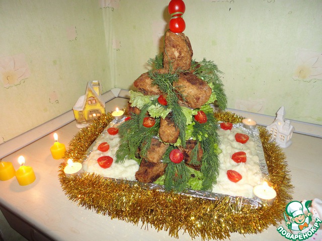 Между кусочками мяса раскладываем укроп. Выкладываем горячее пюре. Зажигаем свечи. Вот и всё готово.