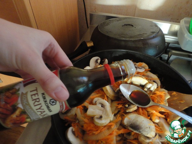 Затем добавляем 2 ст. л. соуса-маринада "Kikkoman", который добавит нашему блюду сладковато-пряный вкус. Тушим ещё 5 минут.