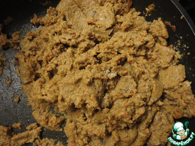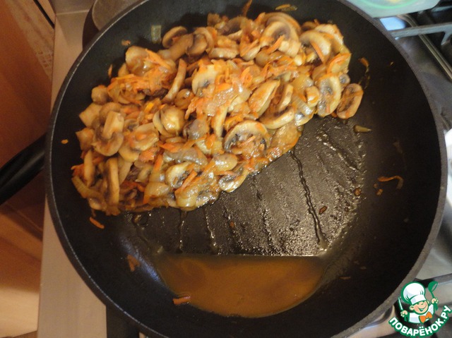 Сверху на мясо выкладываем грибную начинку.