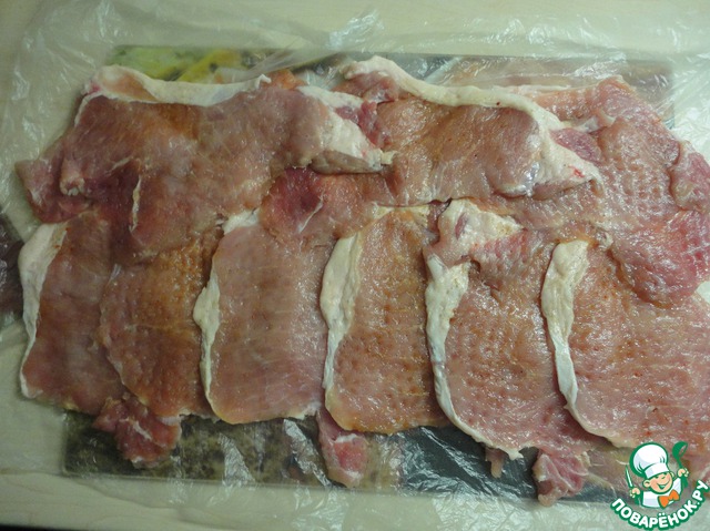 Займёмся мясом. На стол застелить целлофан, сверху выкладываем мясо внахлёст, друг на друга.