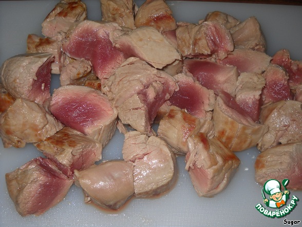 "Отдохнувшее" мясо нарезаем небольшими кусочками. Солим, перчим. Добавляем его к луку.