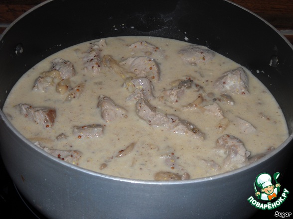 Добавляем горчицу, сметану, вино, бульон, шампиньоны. Все хорошо перемешиваем. Готовим 40-45 мин. на среднем огне, время от времени помешивая.