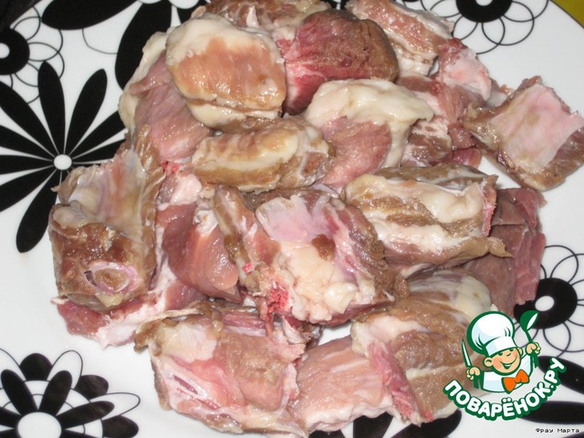 Свиные ребра разрезать на кусочки (чтобы с косточкой были и немного мяса).