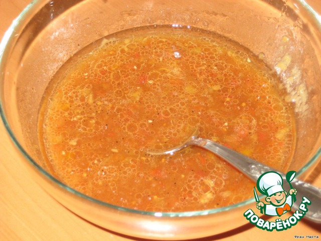 Готовим маринад: мед, горчицу, кетчуп (или томатную пасту), соевый соус, растительное масло, перец или специи сок из двух апельсинов - все хорошо перемешать до однородной массы.