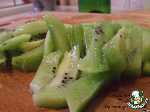 -Для этого возьмем штук 5 киви. Их чистим и режем на дольки.