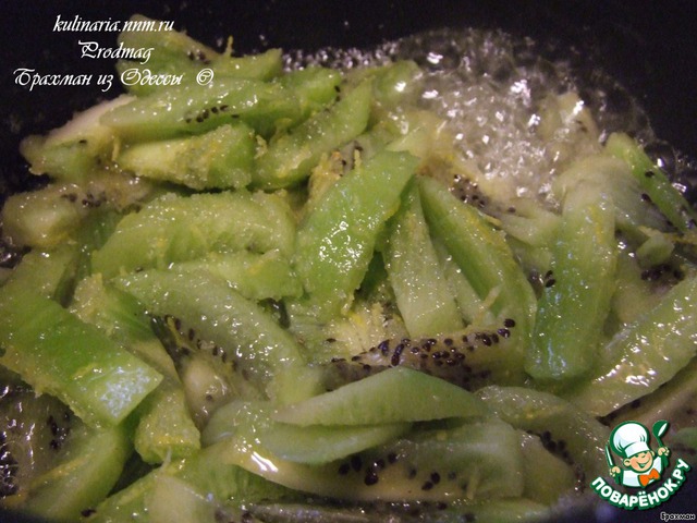 -Кладем киви в сотейник, прибавляем лимонную цедру, несколько столовых ложек сахара (по вкусу). Готовим несколько минут. Можно разминать вилкой.