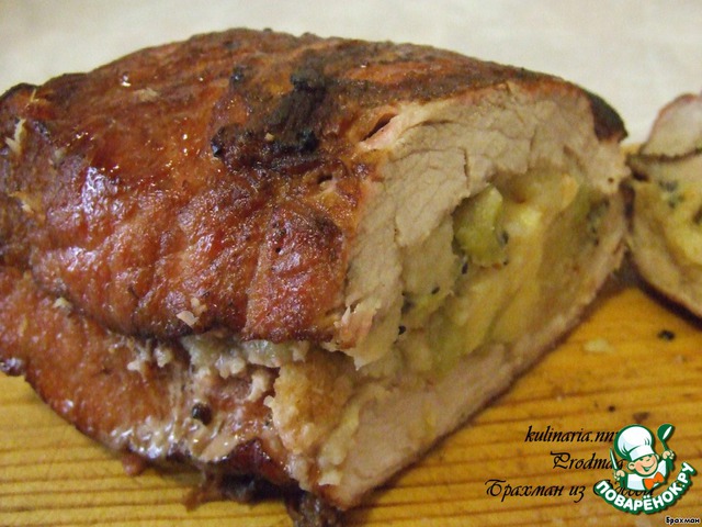 -В мясо кладем нашу начинку. Опытным путем у меня вышло так: я зашиваю мясо с 3-х сторон. В полученный карман легко набить начинку ложкой. Зашиваем. Можно слегка придавить сверху.