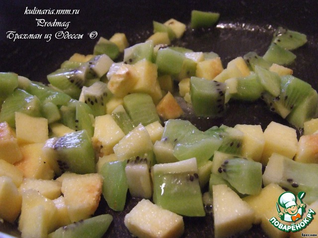 -Разогреваем в сковороде сливочное масло и обжариваем киви и айву минут 5.