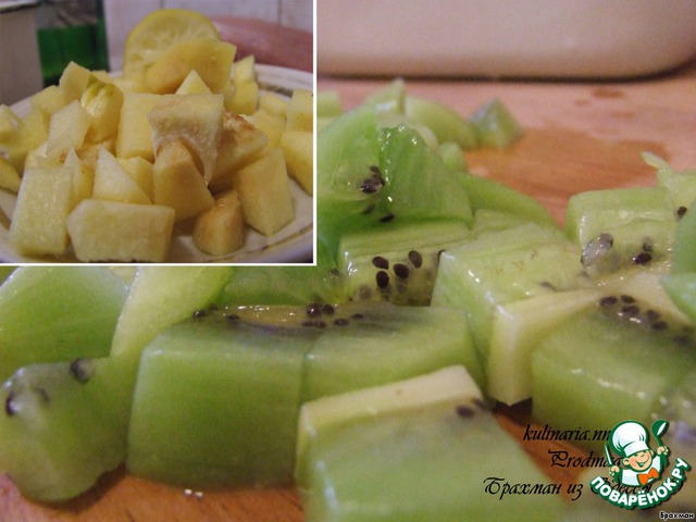 -чистим киви и айву от кожуры. Режем фрукты небольшими кубиками.