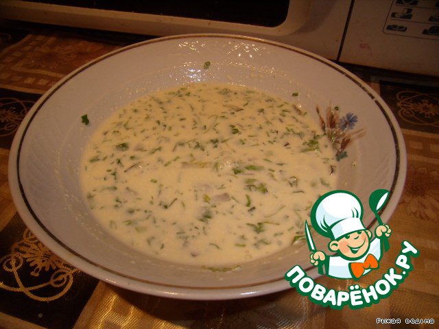 Смешиваем майонез, горчицу, рассол, рубленую зелень и мелко нарезанный огурец.