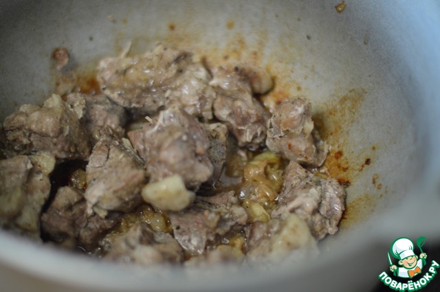 5. Затем открыть казан, вынуть решетку с мясом. В казане останется вот такой жареный лук.