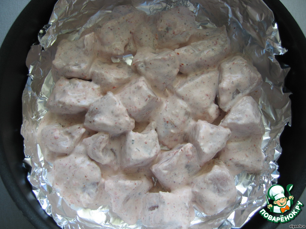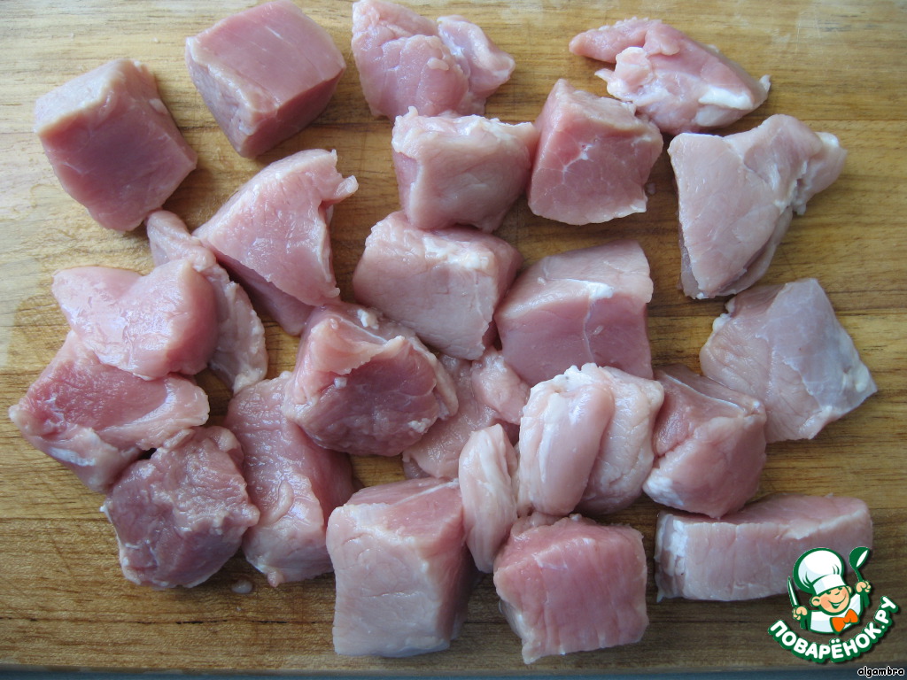 Нарезаем свинину. Я нарезала кубиками как для шашлыка, но можно и на порционные кусочки.