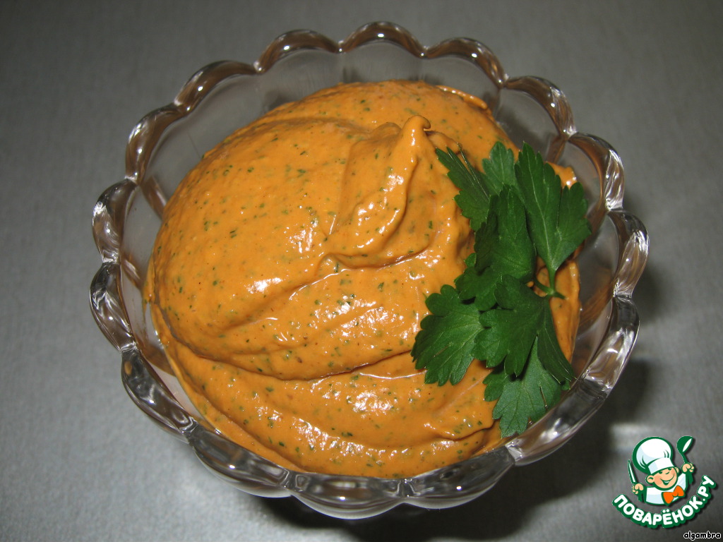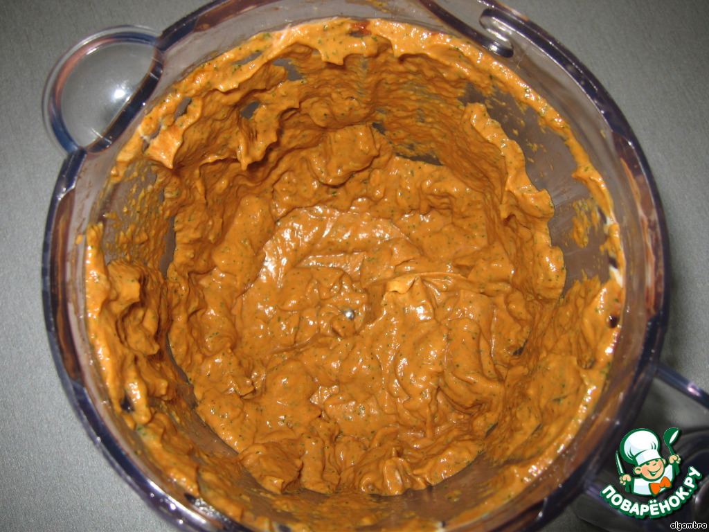 Пока запекается свинина, готовим острый соус. Смешиваем в блендере все ингредиенты: томатную пасту, майонез, горчицу, чеснок, зелень, специи.