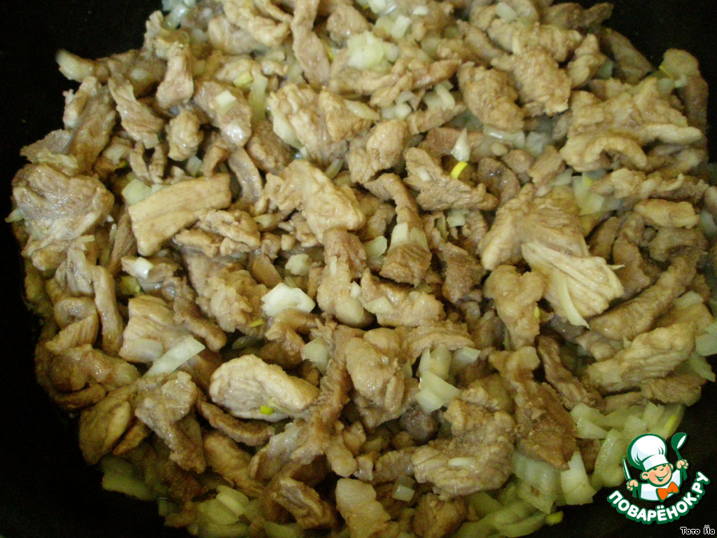 Начнем со свининки. Мелко нарежем ее соломкой или кубиками и обжарим немного.