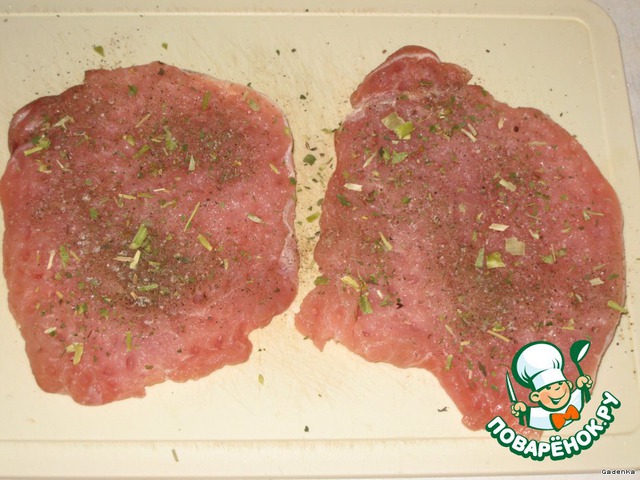 Мясо немного отбить, посолить, поперчить, посыпать сушеными травками (базилик, тимьян, орегано, майоран, что есть в наличии), натереть горчицей и оставить на 40-60 минут.