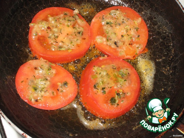 Чеснок выдавить и растереть с перцем, солью, травками и смазать этой смесью помидорки.