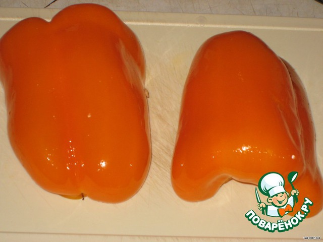 Перец разрезать на половинки, вычистить косточки, слегка смазать растительным маслом и запечь в духовке примерно 15 минут, до начала зарумянивания корочки.