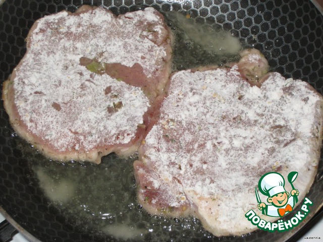 Мясо обмакнуть в муку, коротко один раз с каждой стороны, что прилипло, то прилипло, купать в муке не надо.