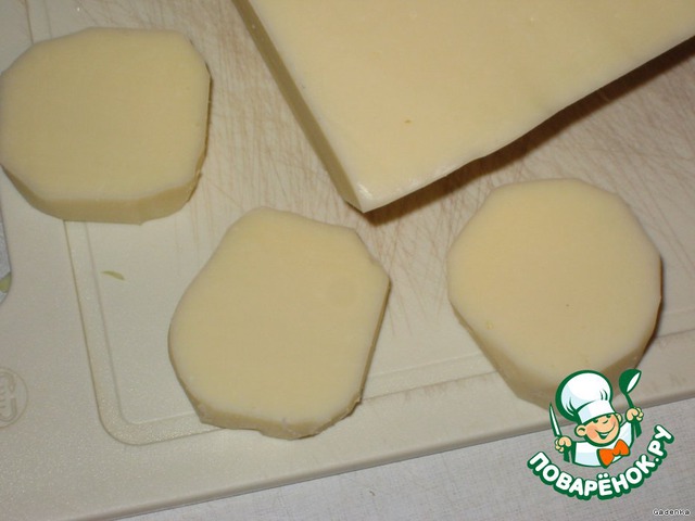 Из сыра вырезать небольшие кружки, примерно в 1 см толщиной и 3 см в диаметре.