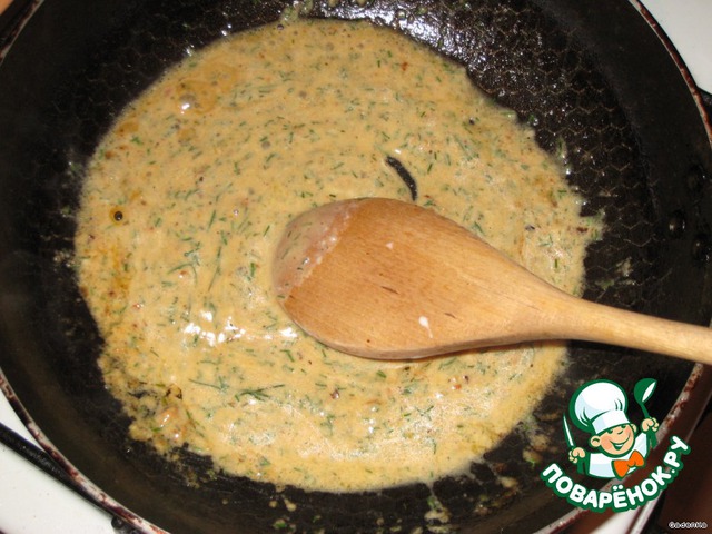 Добавить в эту сковороду вино, не убавляя огонь и дать прокипеть вину 1-2 минуты, затем влить сливки с мукой, добавить белый перец, укроп, перемешать, немного сгустить, выключить и накрыть крышкой.