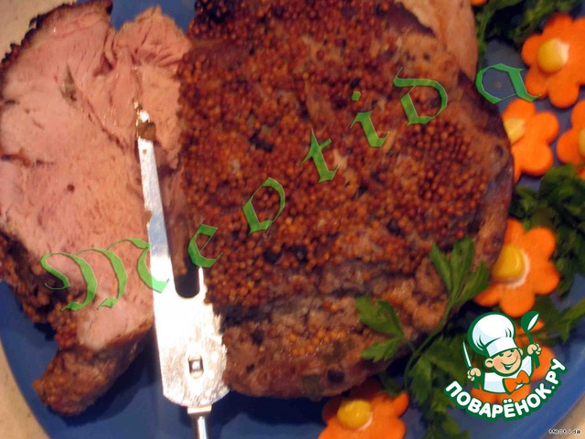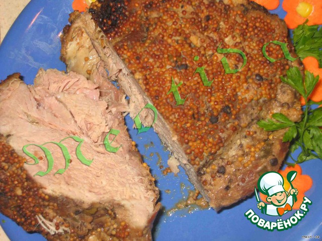 Свининку помыть, обсушить бумажными полотенцами и со всех сторон намазать смесью хрена со специями. Затем хорошенько пропитать мартини и соком лимона. Ну и в завершение обильно посыпать зернышками горчицы.