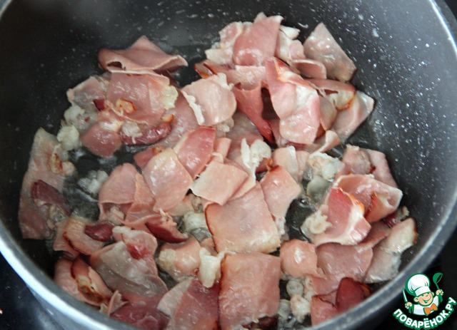 Нарезать полосками или кубиками бекон или с/в ветчину.