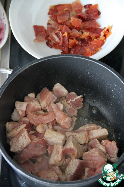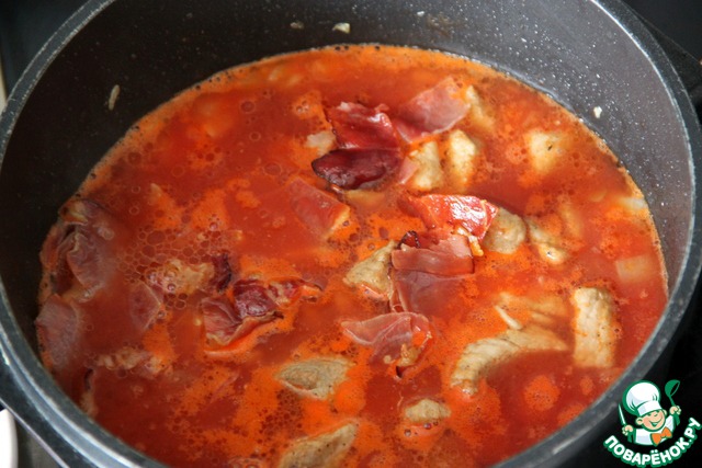 Добавить томатную мякоть в сотейник к луку, вернуть в него же поджаренные мясо и бекон, добавить немного воды (0,5 стак.). Уменьшить огонь и тушить 15 мин.