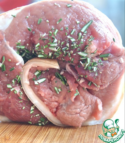 Мясо очень хорошо посолить, поперчить. Посыпать рубленым розмарином и листиками тимьяна.