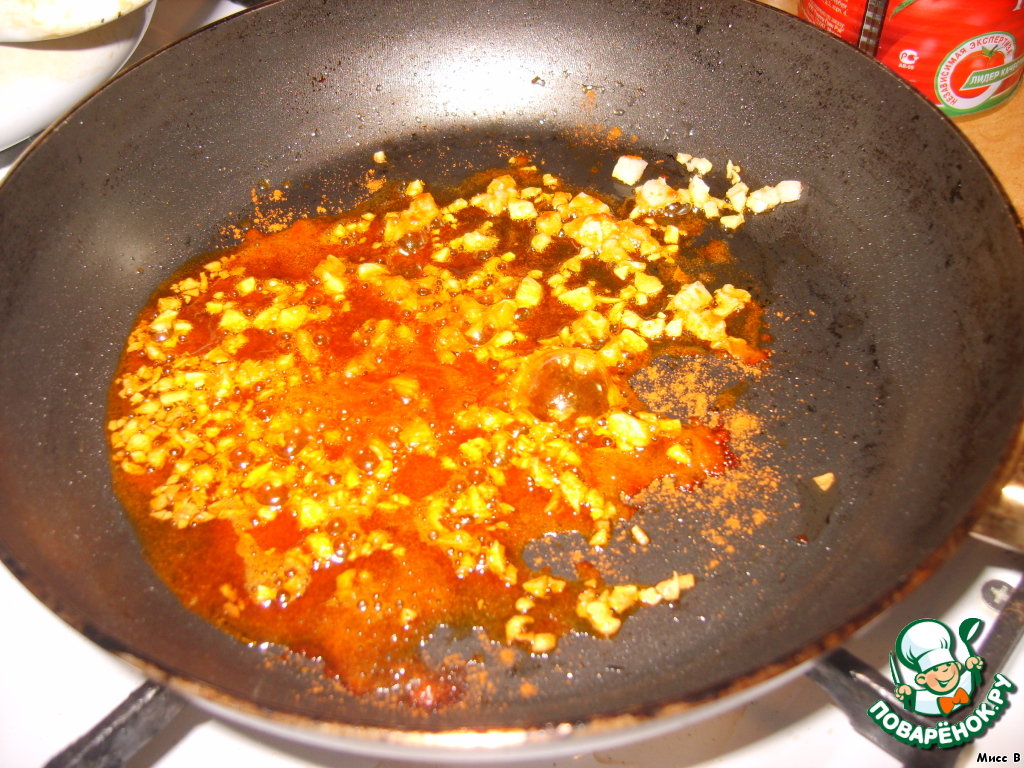 2. Тем временем готовим соус. На сковороду бросаем мелко порезанный чеснок и чили. Обжариваем пару минут.