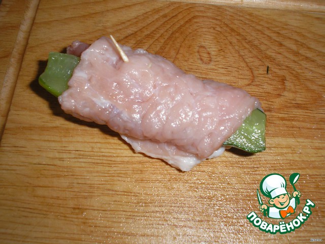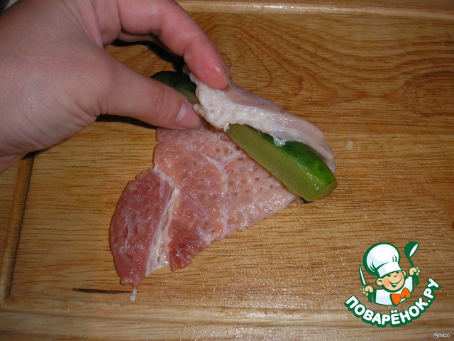 2. Соленый огурчик нарезать брусочками (у меня соленого в хозяйстве не нашлось, в дело пустила малосольный). На край свиной отбивной кладем огурчик, сворачиваем в рулетик и скалываем зубочисткой.
