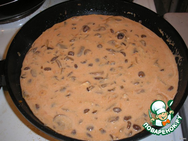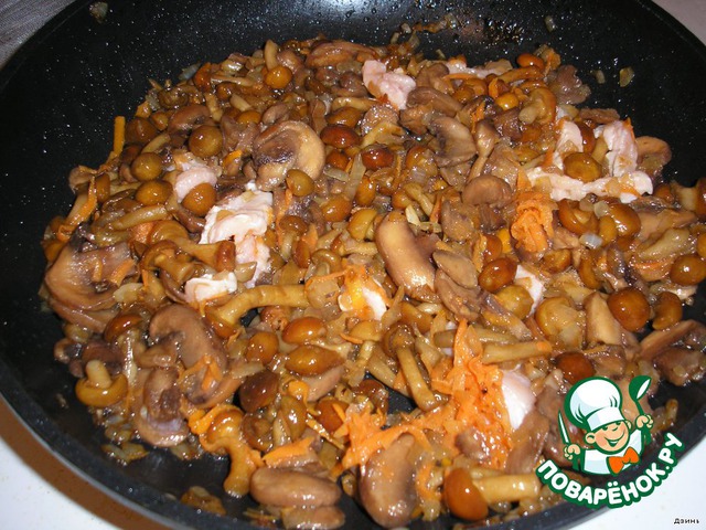 5. Добавляем грибную смесь, минут пять обжариваем.