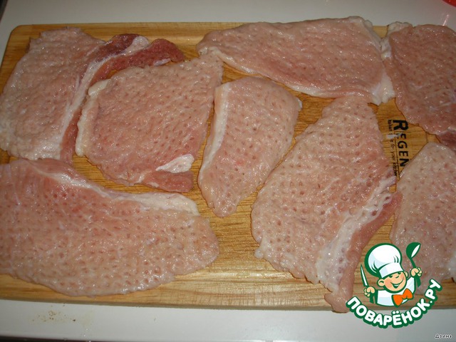 1. Свинину нарезать кусочками, каждый кусочек отбить, посолить - поперчить.