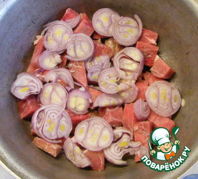 Мясо режем на средние кусочки, лук кольцами.