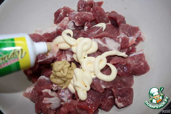 Мясо нарезать небольшими кусочками. Смешать его с майонезом и горчицей. Посолить. Все перемешать и оставить мариноваться на 30 минут.