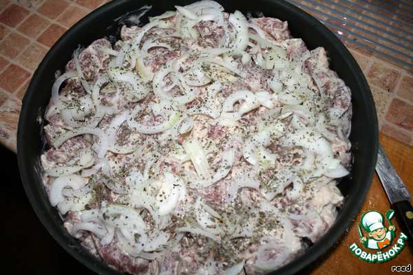Лук нарезать полукольцами. Мясо выложить в форму, на него - лук. Присыпать базиликом.