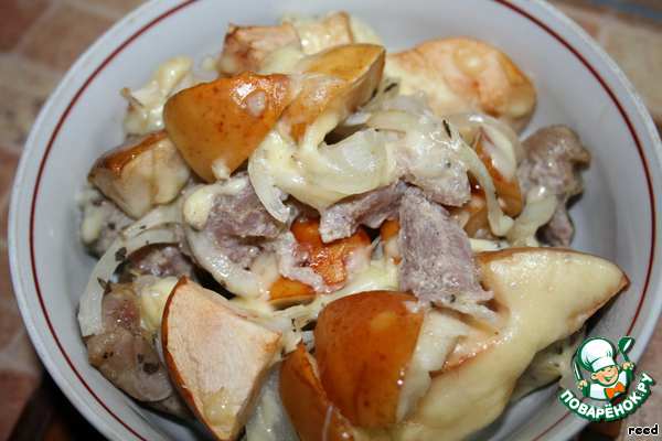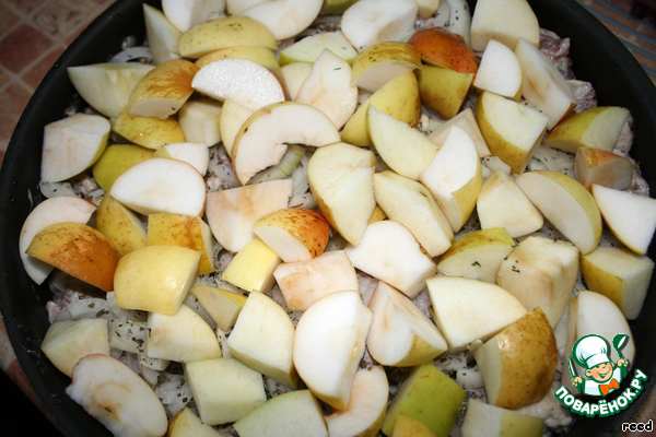 Затем выложить яблоки на мясо с луком. Накрыть форму фольгой и поставить запекаться в духовку на 1 час 30 минут при температуре 180 градусов.