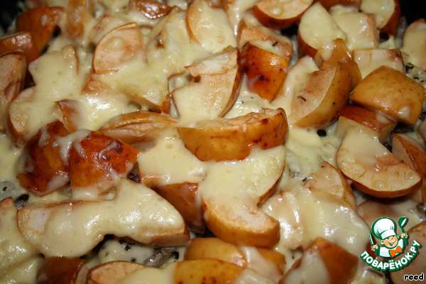 Когда будет готово, посыпать сверху сыром и поставить опять в духовку на 5 минут, чтобы сыр расплавился.