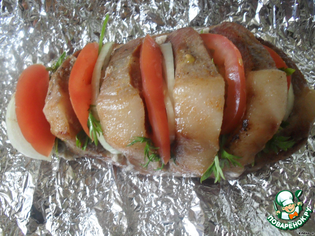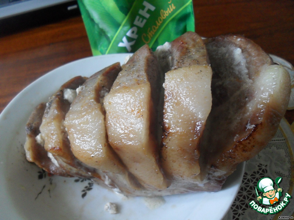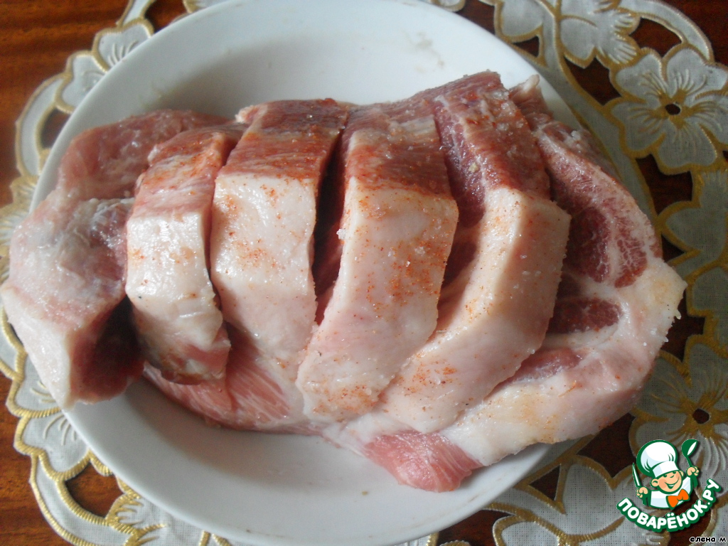Кусок свинины нарезать "гармошкой" (не дорезая куски до конца), посыпать приправой, перцем, сахаром.