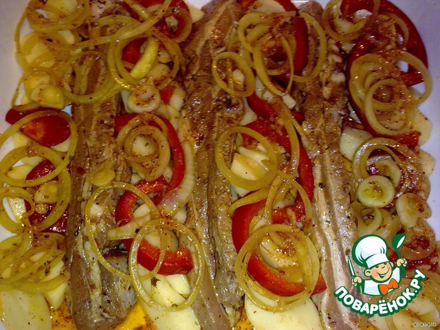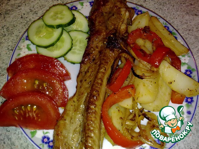 Грудинка, маринованная и запеченная с овощами