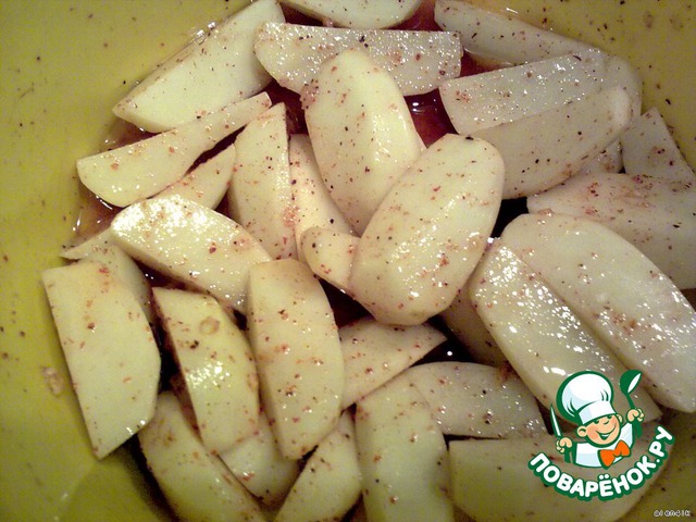 Молодой картофель очистить, нарезать дольками. Посыпать сладким молотым перцем (паприка), посолить и добавить растительное масло (или оливковое). Выдавить чеснок. Перемешать и оставить на 15-20 минут (можно все делать одновременно)
