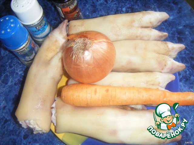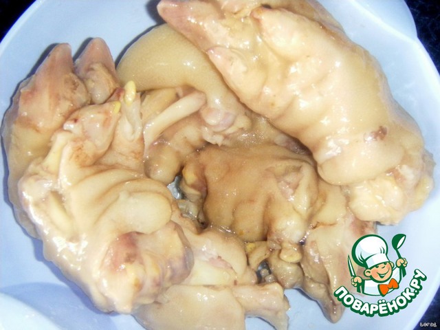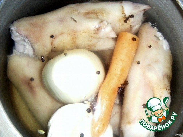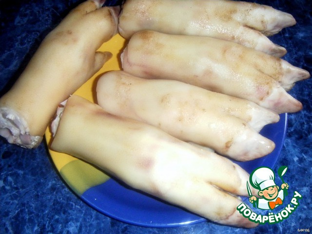 Ножки поскоблить, вымыть и залить холодной водой и оставить на 2 часа(если ножки от молодой свинки, если от взрослой), то на ночь