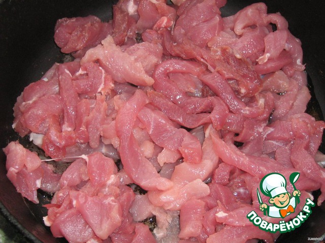 Мясо нарезать тонкими полосками и обжарить в растительном масле.