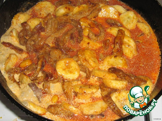 И вот, когда я всё это приготовила, то пришла в ужас, вдруг мой половин, увидев бананы в мясе, откажется кушать! Тогда я всё хорошенько перемешала, бананы размяла, они очень мягкие и хорошо разминаются при размешивании, и добавила ещё чесночку. Не поверите, это так вкусно, бананы с чесноком! В составе я чеснок не упомянула, т. к. в оригинале его нет. Короче, мой ел и добавки просил, и добро дал, чтоб чаще такое готовила. Но сам не понял, с чем это мясо, пришлось расколоться... боялась зря, скандала не было!
