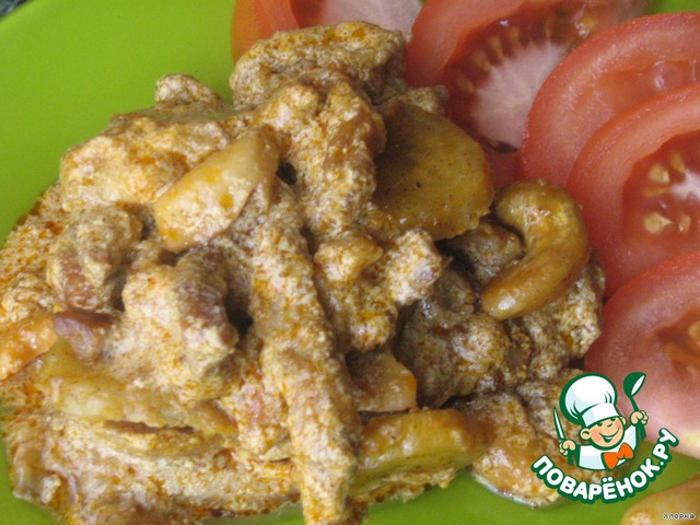 Когда мясо будет почти готово, добавить орешки и паприку.