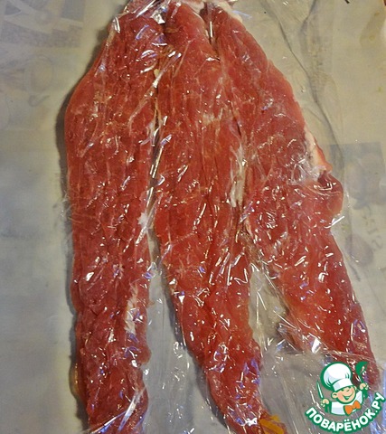 Вырезку накрыть пищевой плёнкой и немного отбить, чтобы она была нежнее и быстро приготовилась.