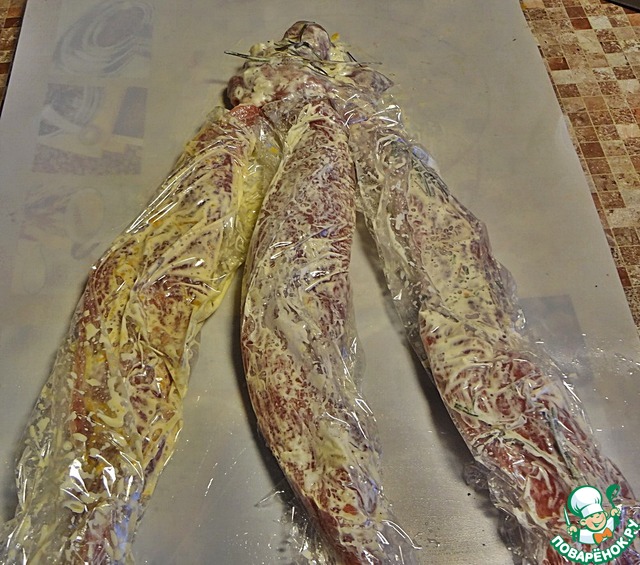 Каждую из трёх частей вырезки намазать своим маринадом и сразу завернуть эту часть в пищевую плёнку, чтобы они между собой не соприкасались. Оставить мариноваться минимум на 2ч. а можно и на ночь в холодильнике. Когда мясо замаринуется, его можно будет убрать в морозилку до часа Х, чтобы не отвлекаться в день праздника на это мероприятие.